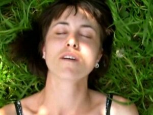 Commedia cagna bruna si masturba la figa succosa all'aperto